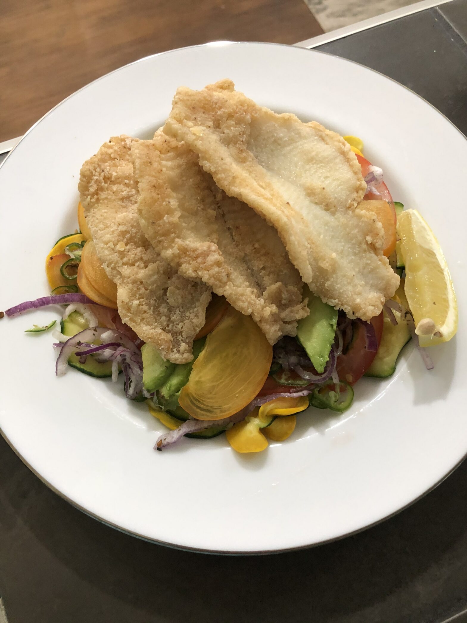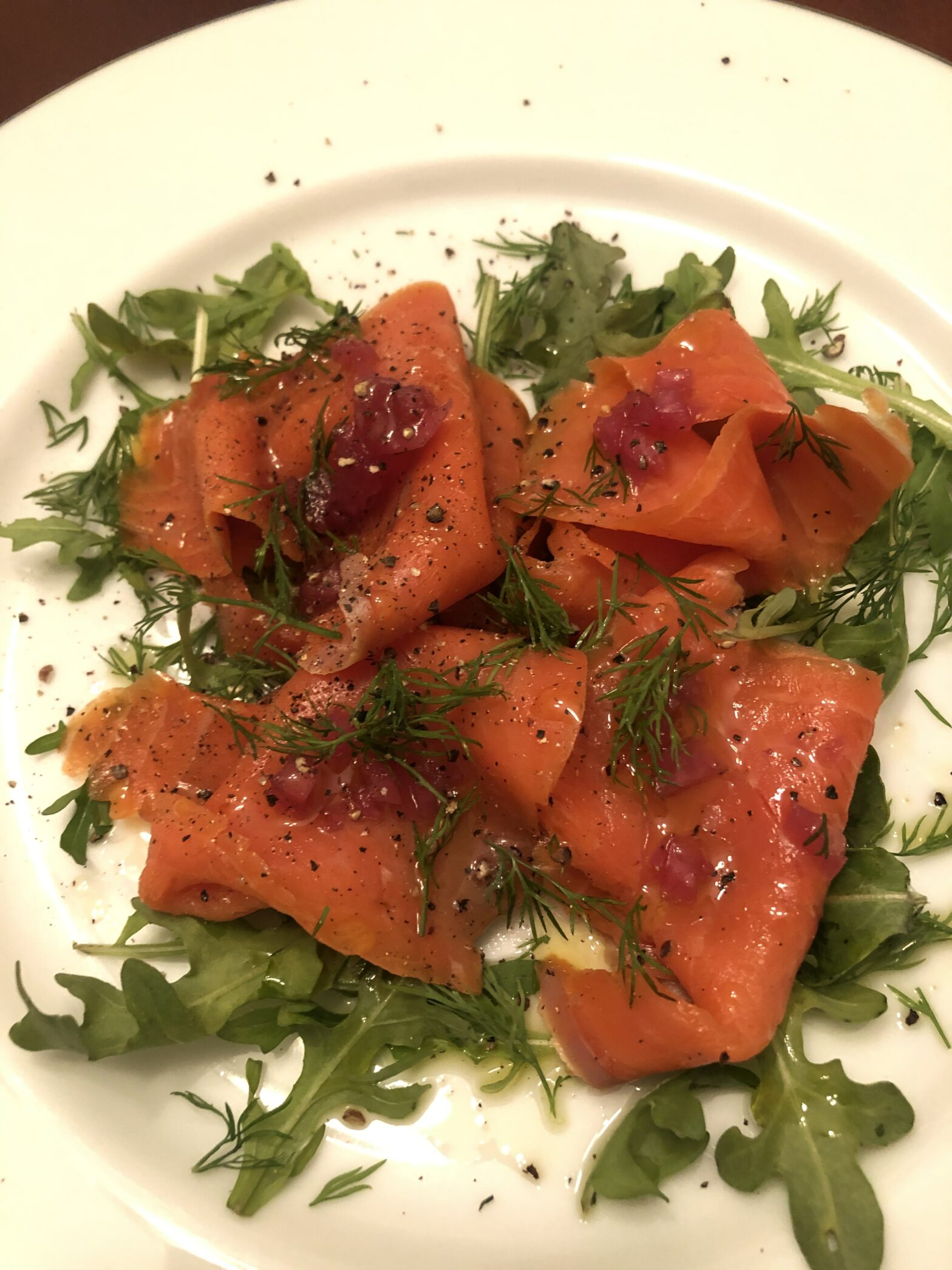 Smoked socket salmon Arugula Fresh Dill Shallot mignonette Olive oil Cracked Pepper
