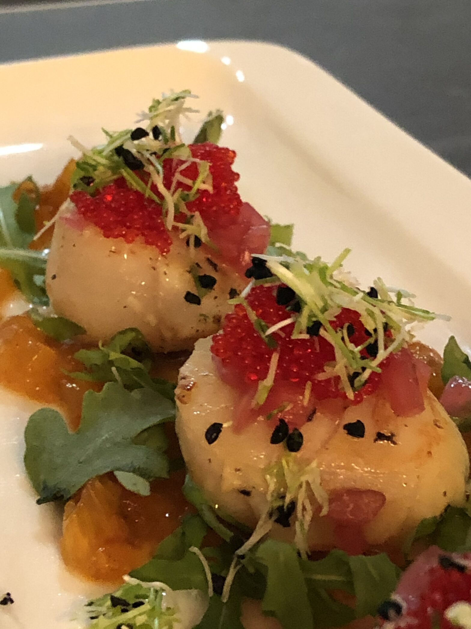 Hokkaido scallops Persimmon Arugula Pickled onion Tobiko Onion sprouts